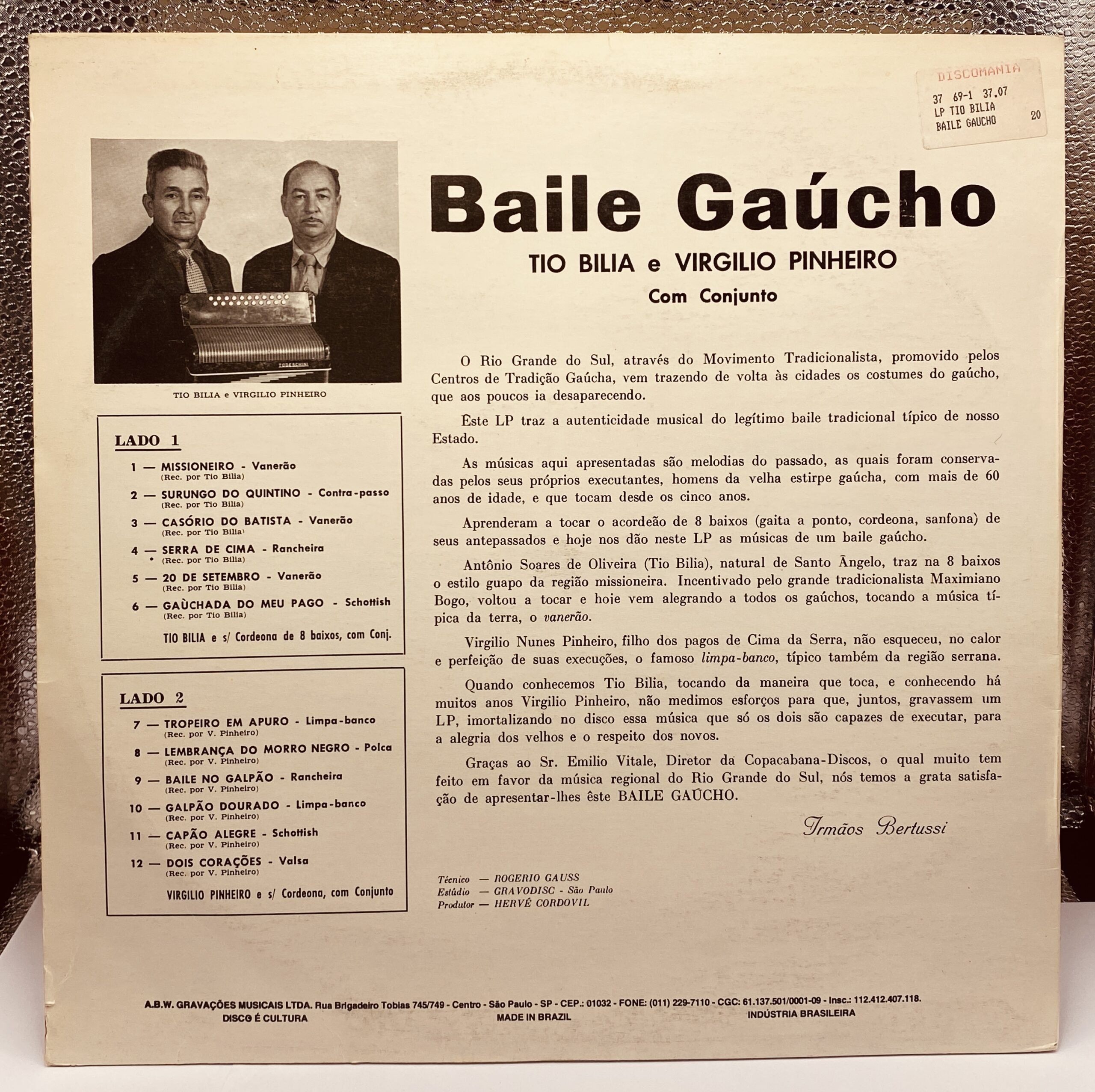 Lp – Tio Bilia e Virgilio Pinheiro – Baile Gaucho